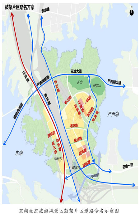 东湖风景区的多条新路名充满诗情画意,如沐阳路、疏雨路、挽月路、揽风路、观云路、望霞路。通告中说,取“阳光、日月、山水、微风、细雨、云霞”等浪漫美好场景,形成系列路名,体现区域用地开发功能导向,表达对区域发展的美好愿望。