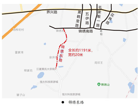 位于江夏区五里界街道辖区,南北走向,南起锦绣新村锦绣南路,北至江夏黄氏大宗祠。道路全长约1190米。因该路位于锦绣新村东侧,故名。