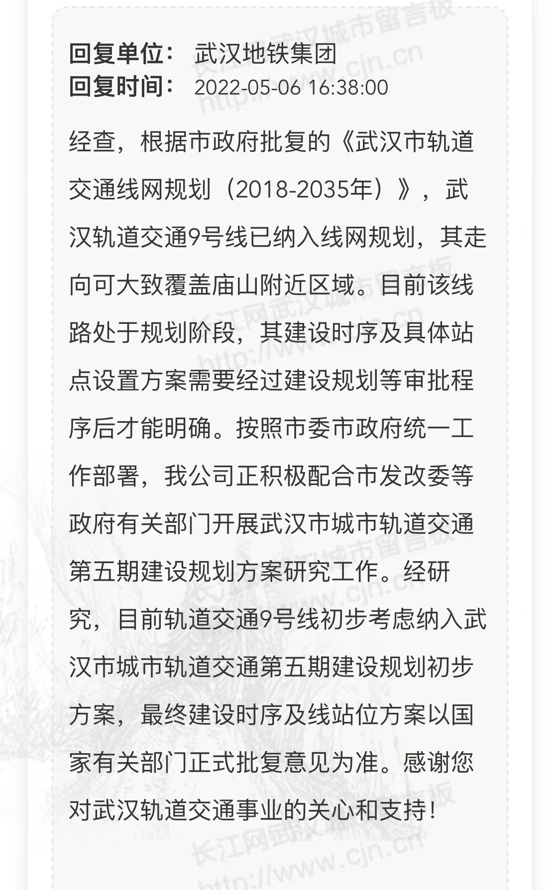 近日,有网友在武汉城市留言板上咨询,地铁9号线何时开工?对于网友的问题,武汉地铁集团回复称,经查,根据市政府批复的《武汉市轨道交通线网规划(2018-2035年)》,武汉轨道交通9号线已纳入线网规划,其走向可大致覆盖庙山附近区域。目前该线路处于规划阶段,其建设时序及具体站点设置方案需要经过建设规划等审批程序后才能明确。