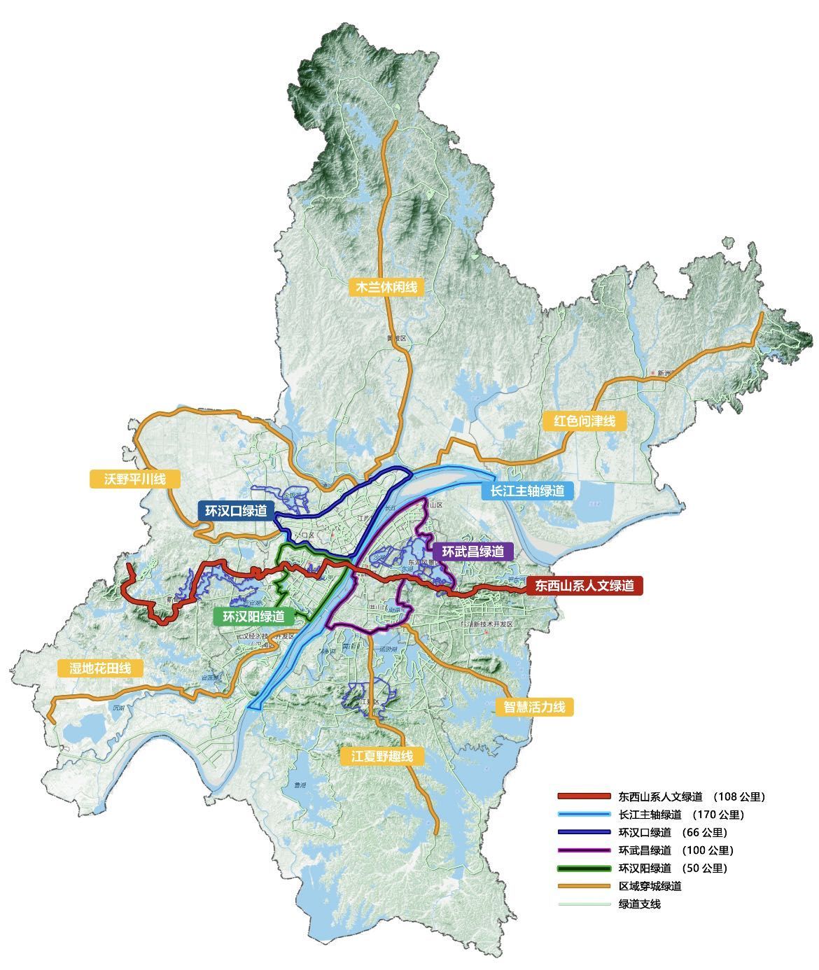 “三环”为环汉口绿道、环汉阳绿道、环武昌绿道。“六线”为中心城区向新城区方向的六条放射型绿道,包括东西湖方向沃野平川线、黄陂方向木兰休闲线、新洲方向红色问津线、东湖高新方向智慧活力线、江夏方向江夏野趣线、武汉经开方向湿地花田线。