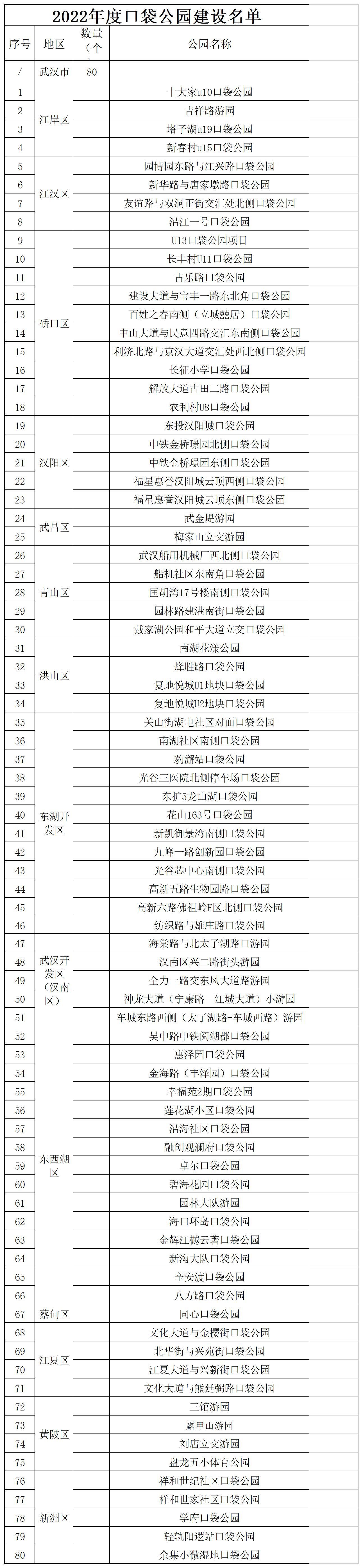 长江日报大武汉客户端5月12日讯今年,武汉将新建80个口袋公园,目前已建成开放11个,22个正在施工。80个口袋的选址已全部确定,快来看看你家门口有没有。