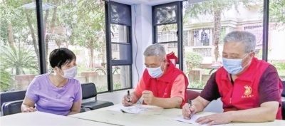 建港社区党员志愿者为居民调解。