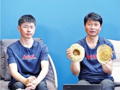 5月12日,陈刚(右)和儿子陈李昊做客长江日报直播间,展示在珠峰采集的化石标本。