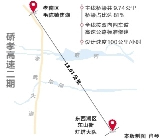 长江日报讯(记者蔡欣星 通讯员胡杰 严晓峰)连接武汉、孝感两地城区的快捷通道硚孝高速二期工程,已完成全部桥梁下构工程和超过80%的上构建设。硚孝高速二期预计明年通车,届时两地市区互通仅需20分钟,汉、孝真正进入“同城时代”。