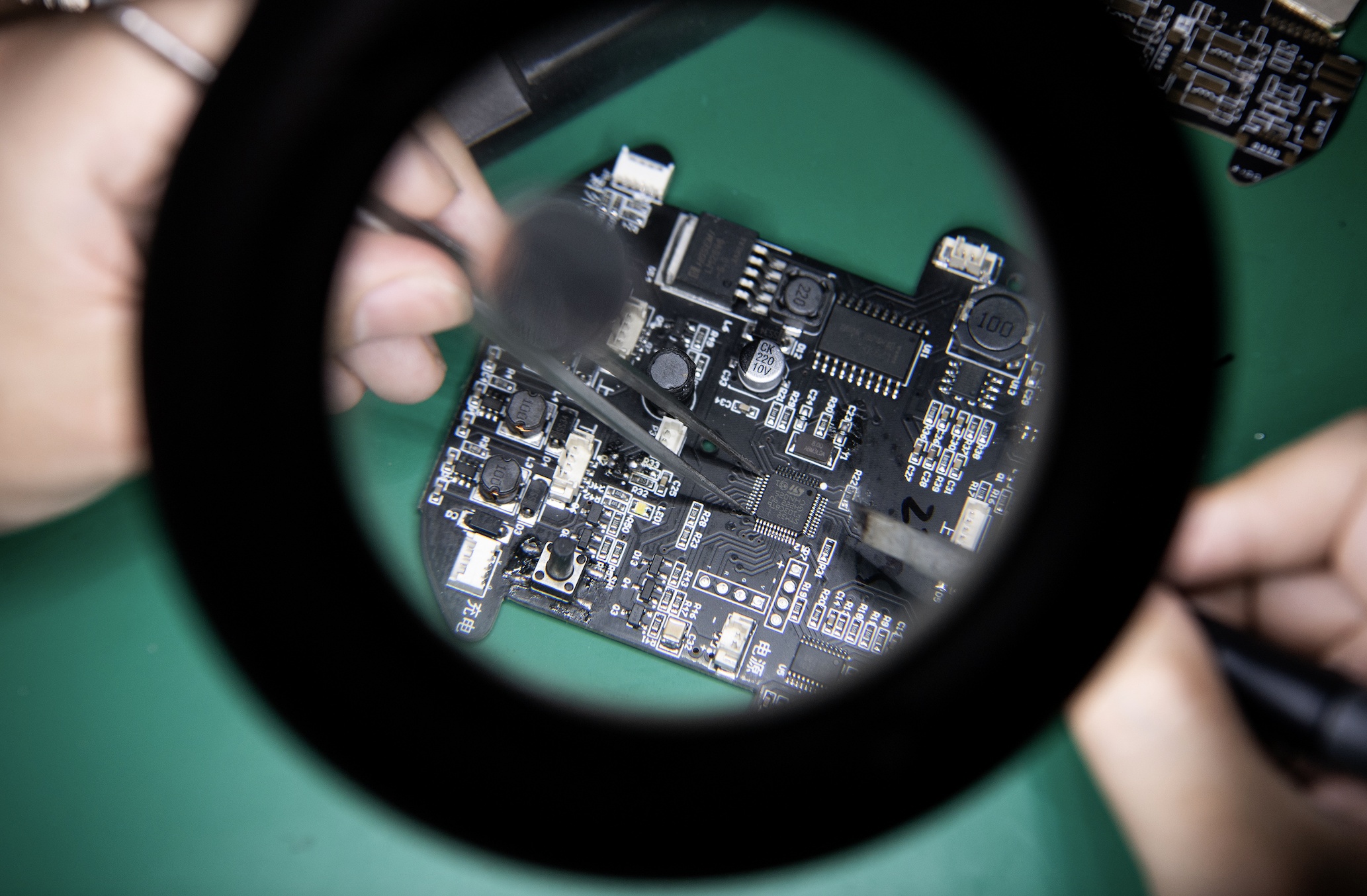 在湖北青创园(光谷)示范园的武汉创现科技有限公司内,一名工程师正在测试自研电路板,这也是该公司研发的智能清洁机器人的核心部件。 记者任勇 通讯员 张璨龙 摄