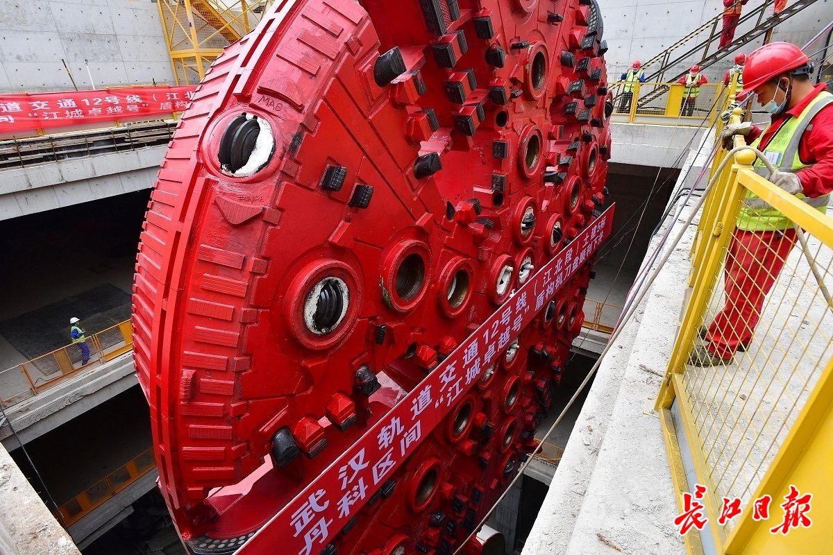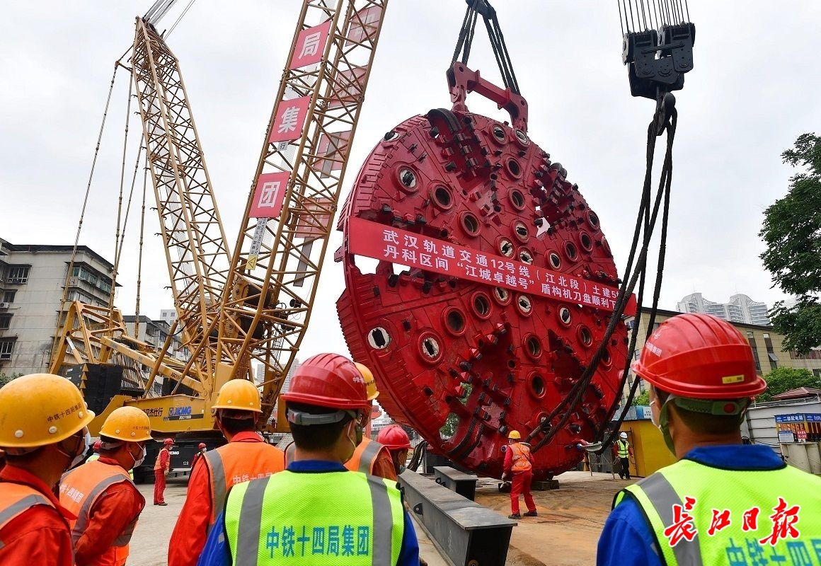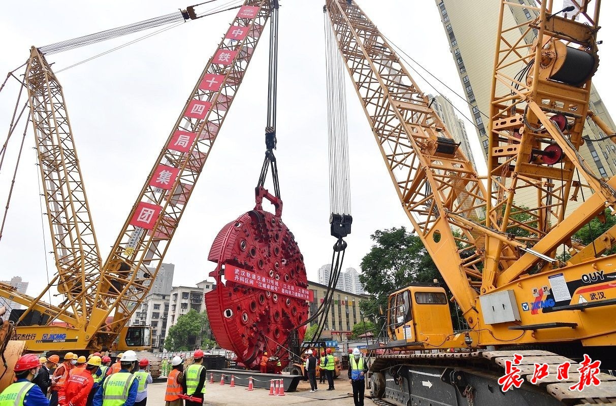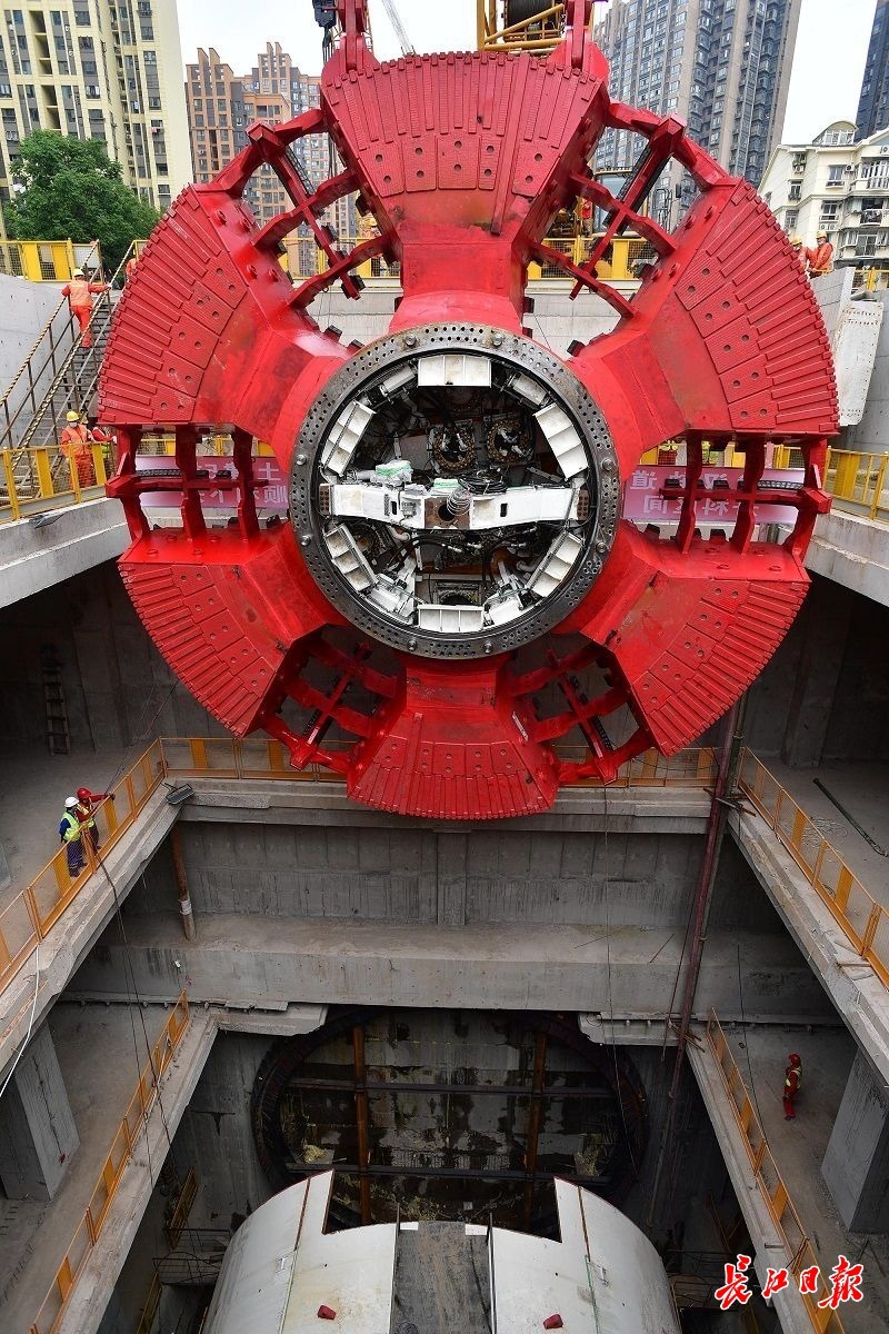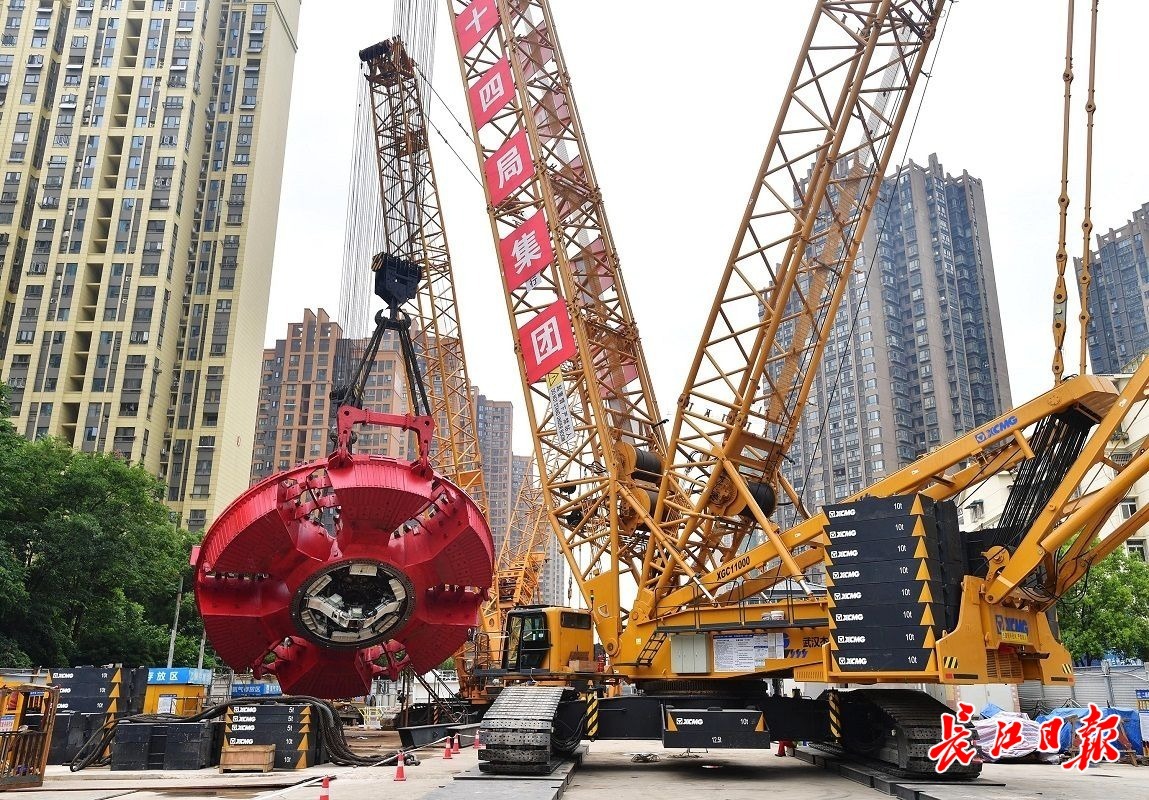 14日上午9时许,长江日报记者现场看到,红色刀盘在两台履带吊车的配合下,缓缓“抬头”“翻身”,移动至始发井上方,慢慢吊装入井。