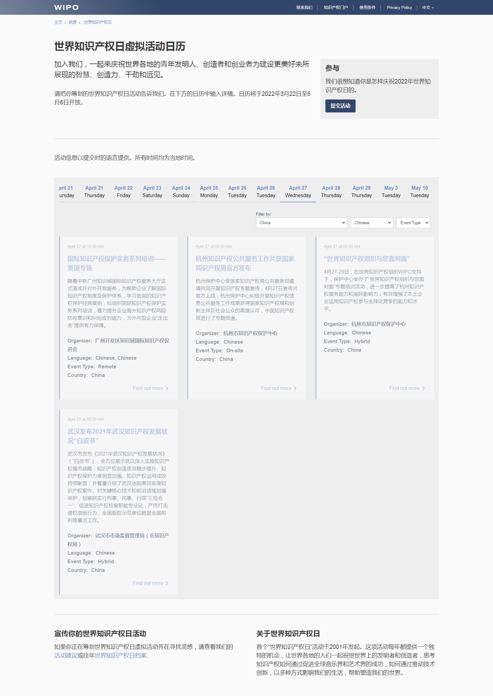 世界知识产权组织官网展示武汉知识产权活动。网络截图