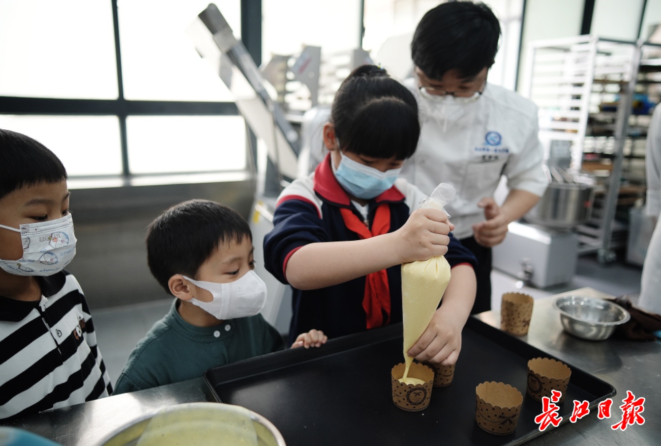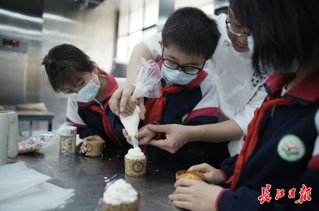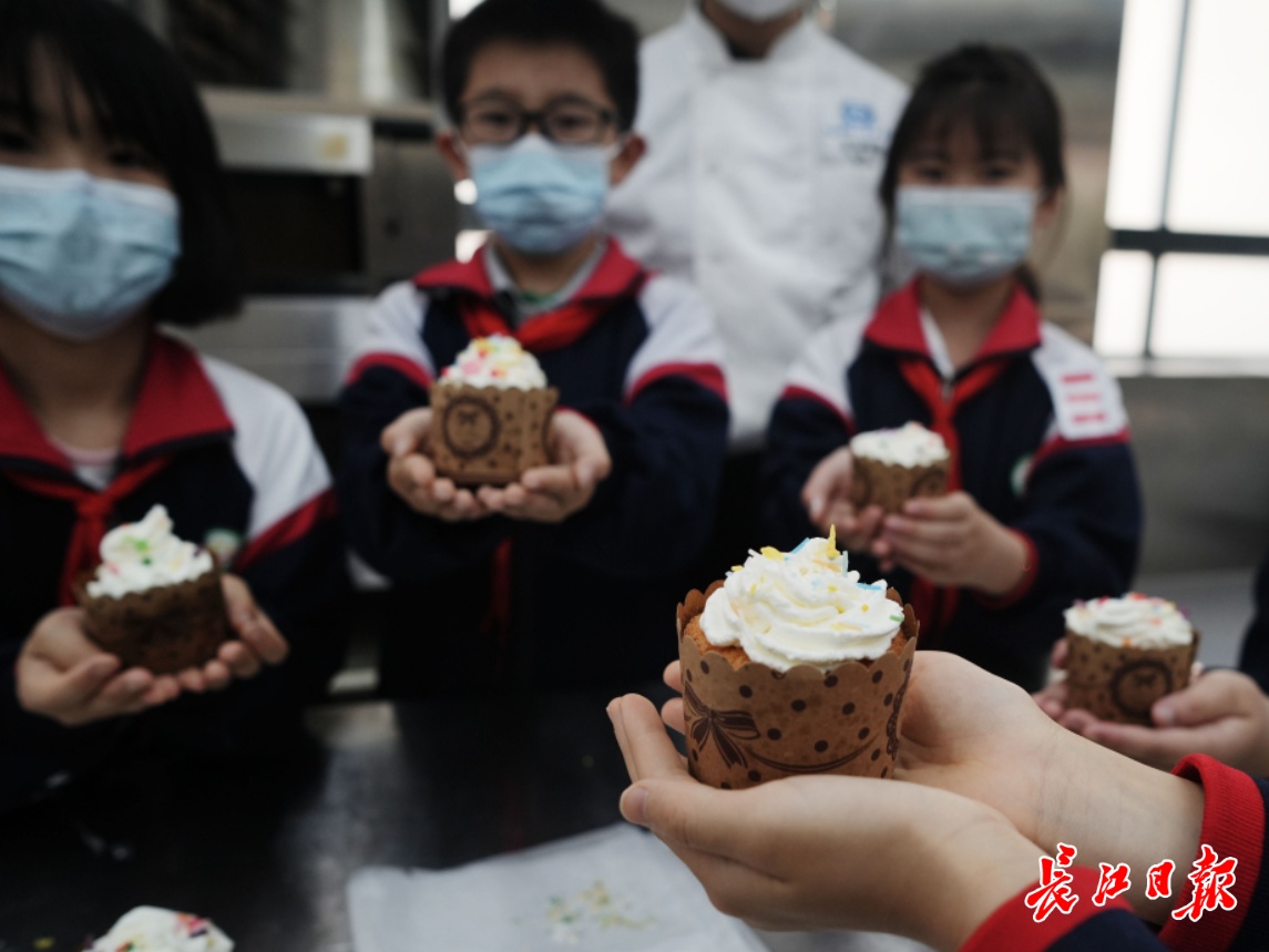 长江日报大武汉客户端5月15日讯(记者周锐 通讯员杨茜)13日下午,青少年宫小学25名小学生走进武汉市第一商校,体验西点制作、茶艺、花式调酒、面塑制作4个项目。小学生们在武汉市第一商业学校老师的指导下,在世界技能大赛糖艺西点项目中国集训基地,亲手完成了小蛋糕的制作和烘焙,大家荣誉感满满。