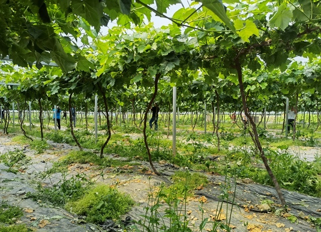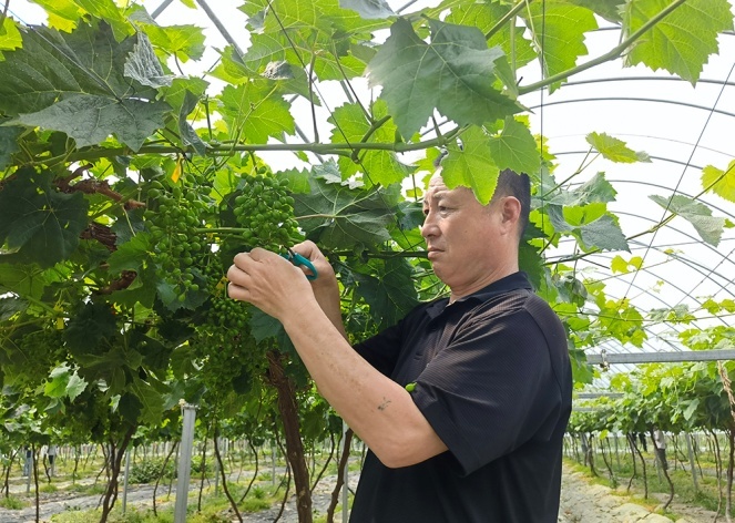 与此同时,位于庆丰村的金浪果蔬种植专业合作社也是一片忙碌景象,500亩阳光玫瑰葡萄园内,近200名工人正在修剪葡萄藤枝。据介绍,目前基地主要工作是循环进行保果、梳果、整枝,以保障果子达到最好的甜度和形状,确保8月份能够顺利上市。