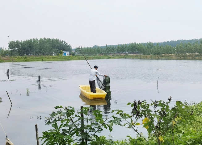 5月10日,在熊口镇洪庄村,刚刚卖完小龙虾的严读坤再次撑船划入虾池,查看地笼内的情况。
