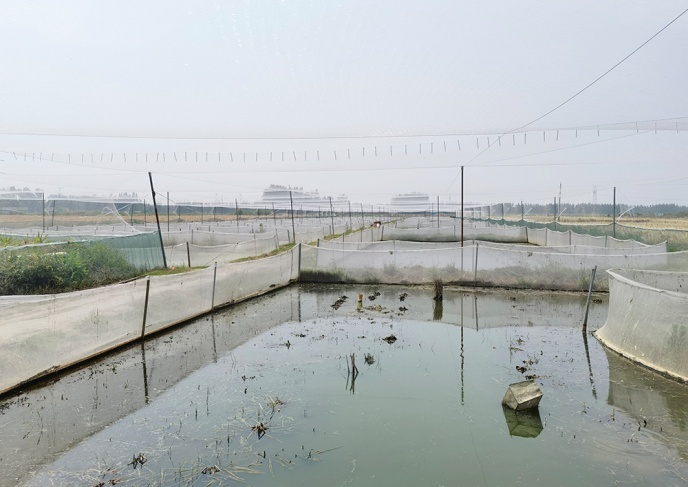 今年3月中旬,洪庄村2组村民蔡鑫强在自己的13亩养殖基地投入了135万尾黑斑蛙苗。目前,蛙苗正值变异期,他和工人们一起,将水塘里的杂草清除,待蛙苗完全变成青蛙后,就要开始铺设食台,投料训食。