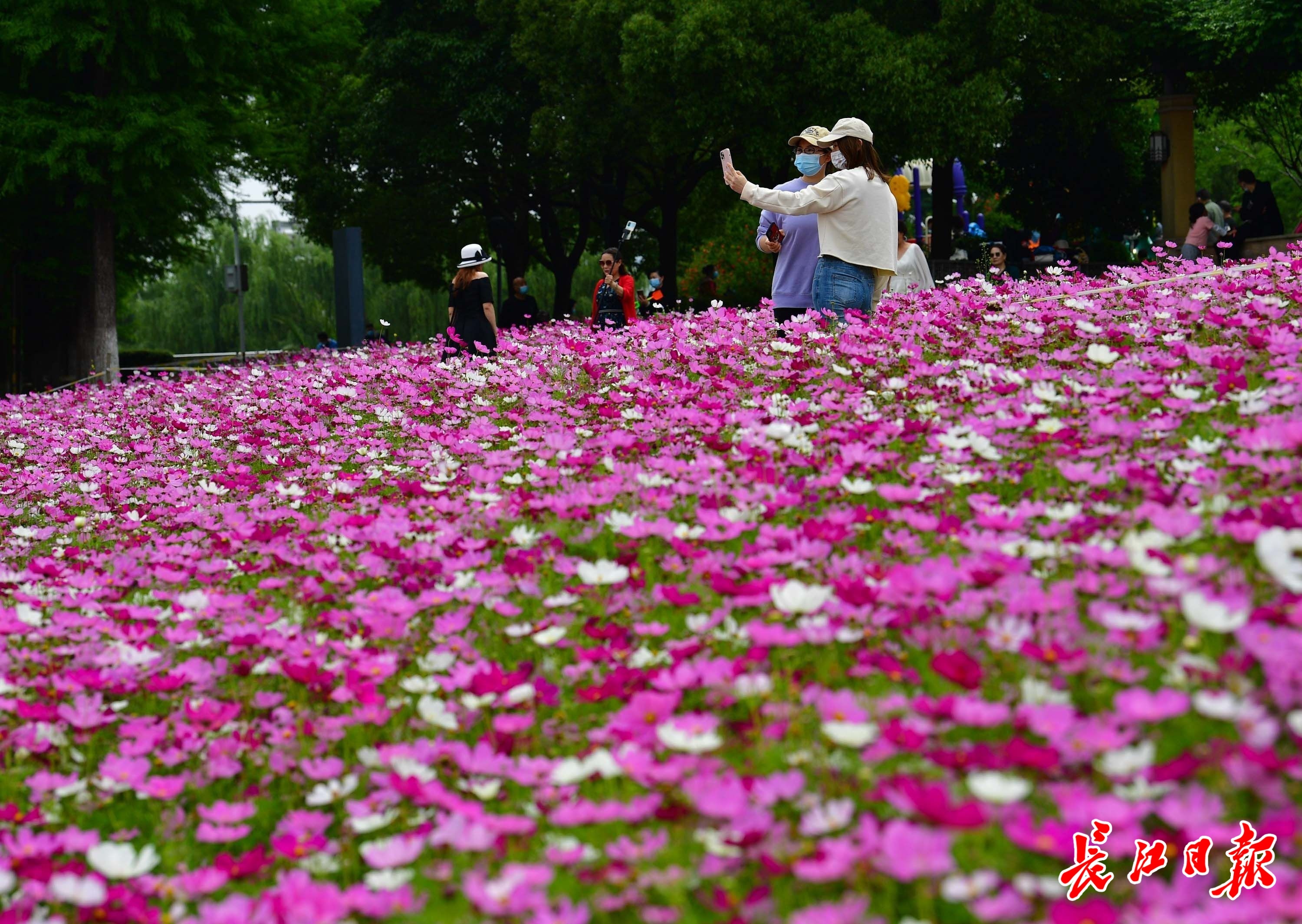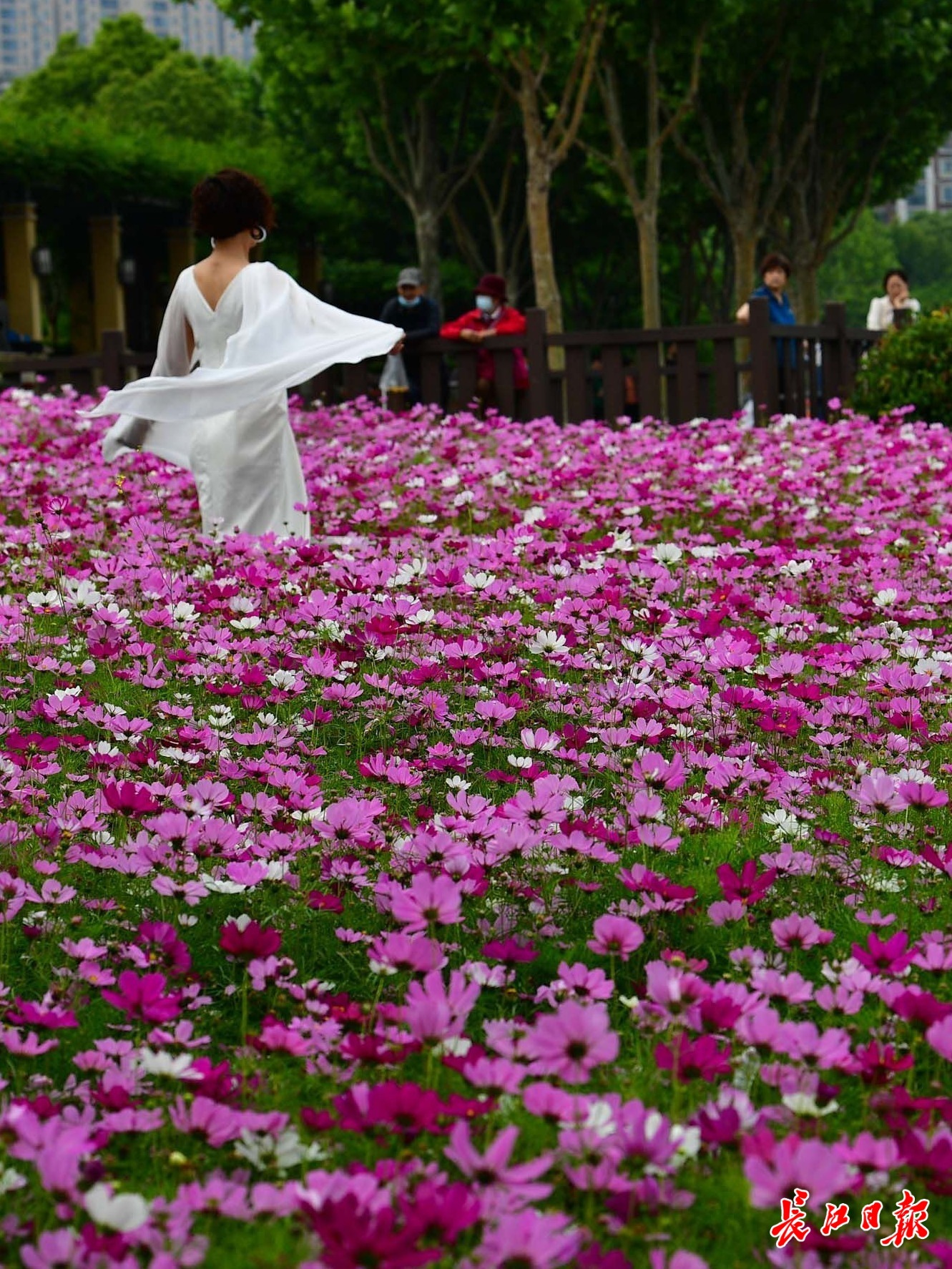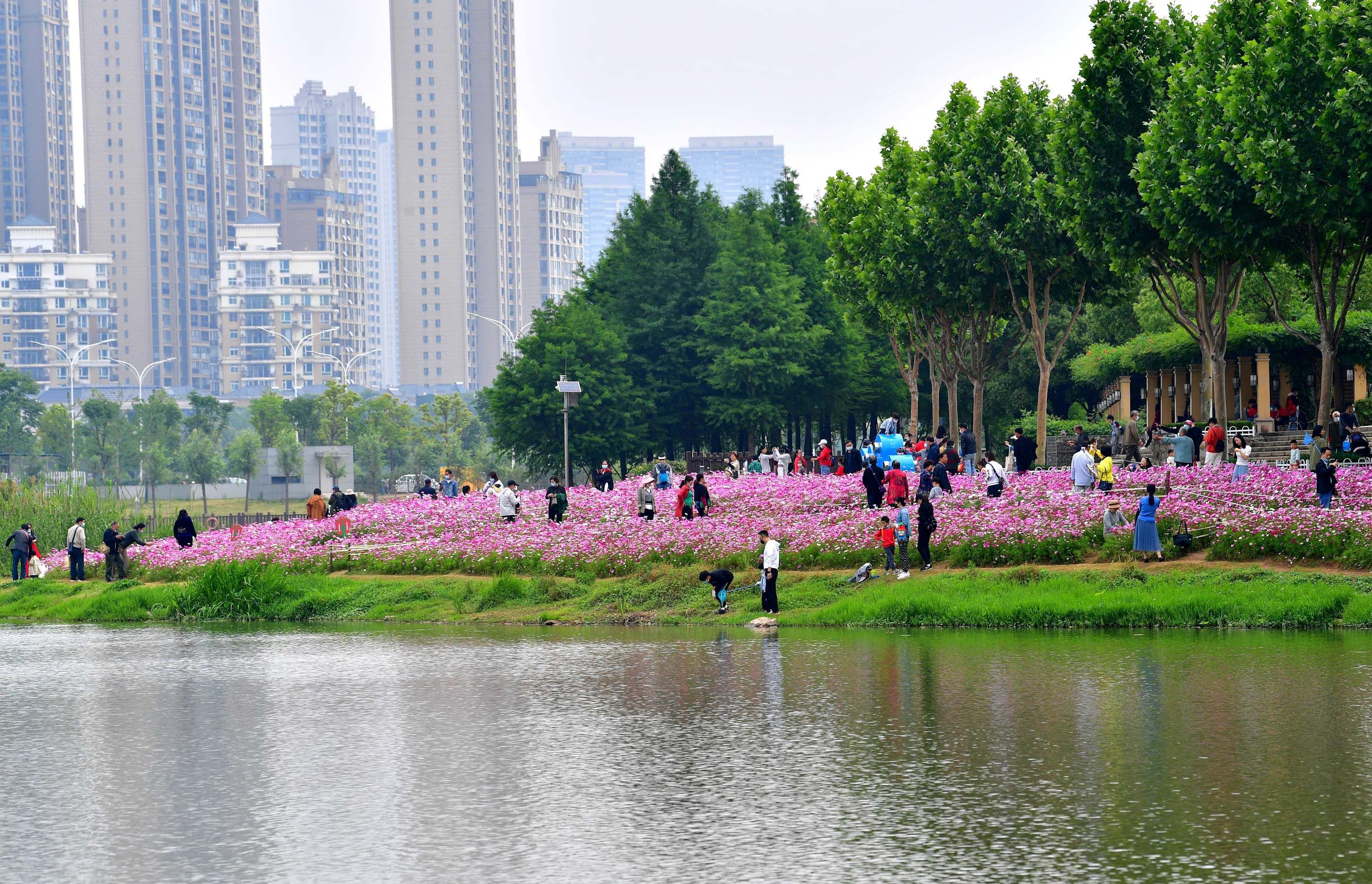 长江日报大武汉客户端5月15日讯 5月15日,武汉市洪山区南湖幸福湾公园东南角沿湖岸边,粉色、紫色、白色的波斯菊灿烂盛开,形成近2000平方米的花海,吸引了众多市民前来游玩。爱美的女士在花海中预留的小径上穿梭来回,起舞拍照,享受都市中的浪漫风光。