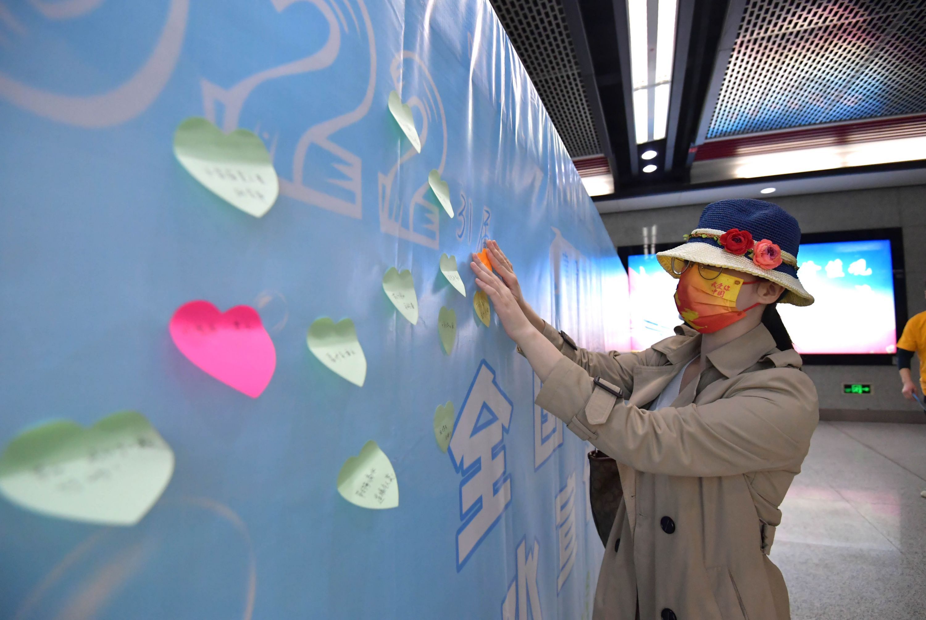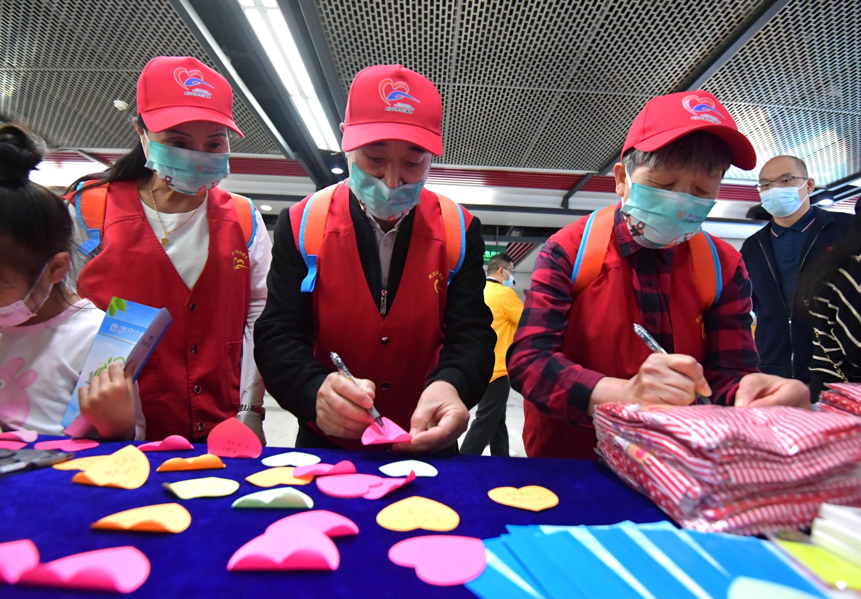地铁志愿者正在手写节水心愿卡。记者刘斌 摄