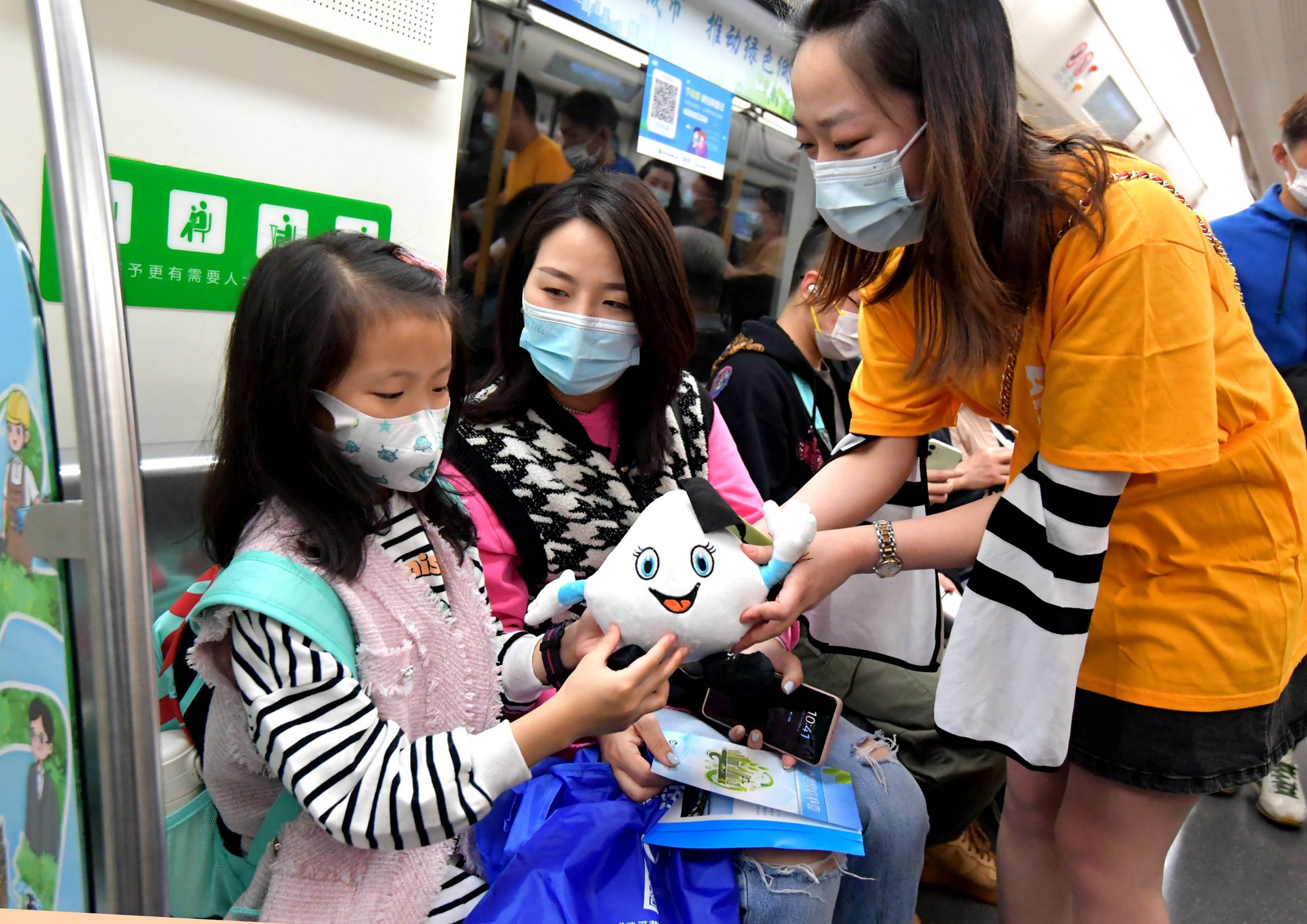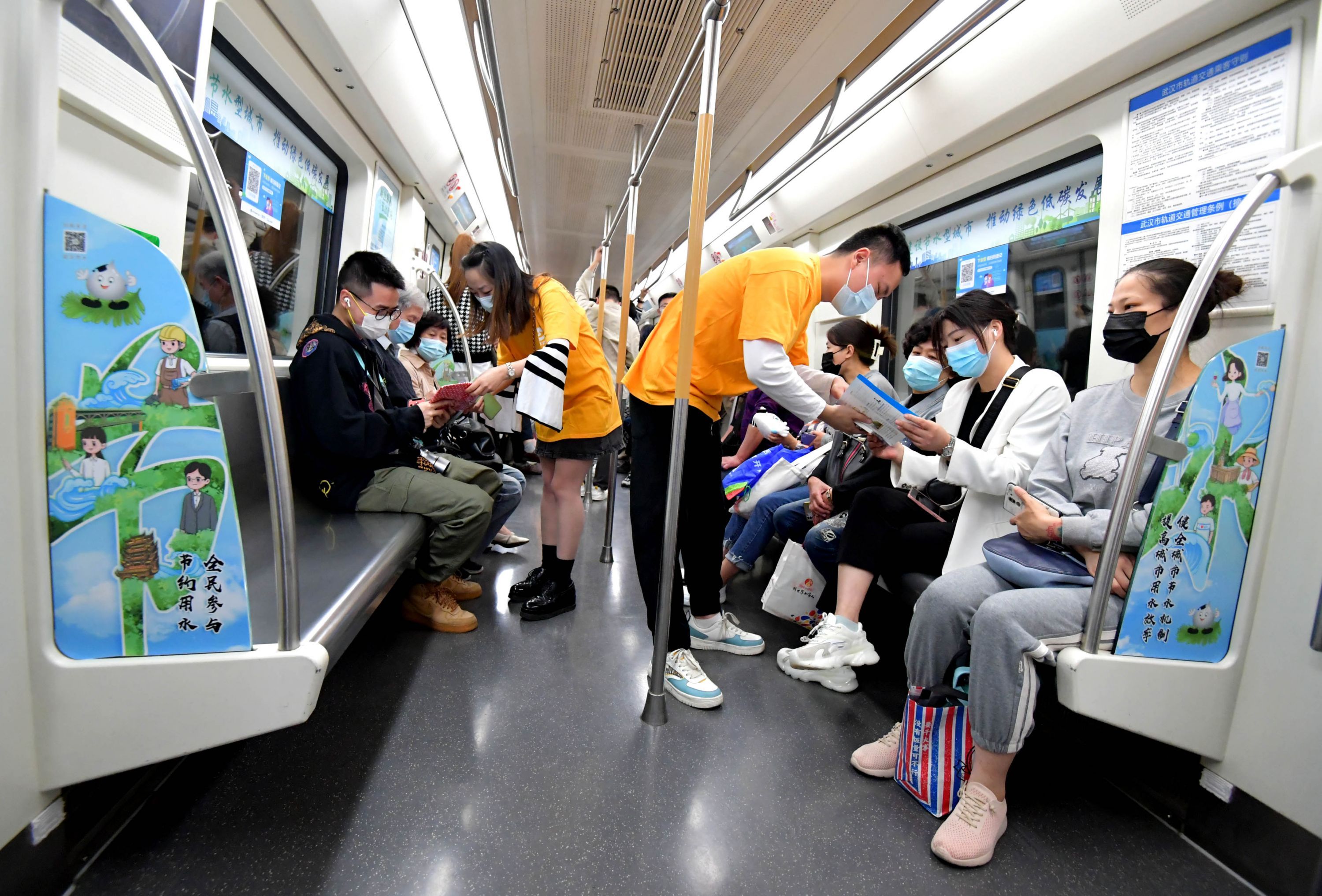 跟随市民一同进入首发专列的还有多名武汉市节水办志愿者与地铁志愿者,大家手拿蓝色节水宣传折页与水宝玩偶向乘客进行节水宣传。