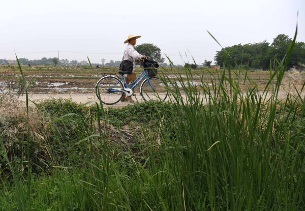 忙碌一上午的余灿推着自行车从水稻试验田经过。