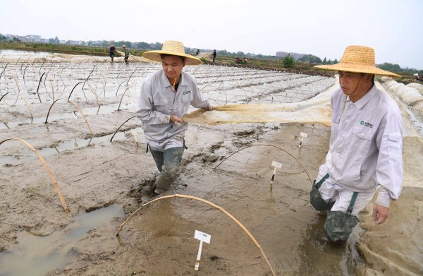 在水稻育种试验基地分布于不同点位的三块面积均约2亩大小的水稻秧田,中种科技中心育种团队成员身着水裤和雨靴在各自负责的水稻田中为播种忙碌,灌水打平做秧厢、插标牌、摆种袋、播种、抹平、装竹弓、盖上防雨防鸟的纱网等上十道工序,科研人员紧张又娴熟地劳作。在灌满水的稻田中,头戴草帽插标牌的恢复系2团队副经理余灿介绍:“我们在海南三亚南繁育种基地也是这样工作,从下田做秧厢播种、田间管理、杂交繁育到收获种子,每个水稻科研人员都要亲力亲为。”