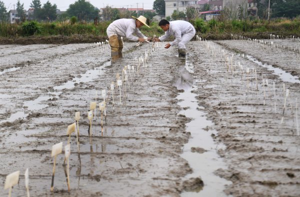 水稻育种团队余灿副经理(左)和产品测试团队成员晏科(右)在水稻田为株系材料的播种按编号插上标牌。