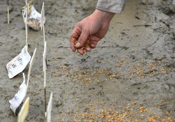 水稻育种团队成员严格按照标牌编号顺序播种。