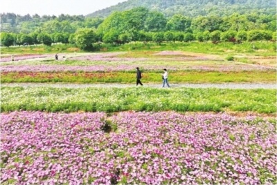 虽是工作日,但梦花源花海已吸引诸多市民游客前来打卡,有的携父母前来踏青,有的和闺蜜前来拍照,有的带着孩子前来亲近自然。成片花海与不远处的青山相伴,更显田园野趣。据介绍,这片花海盛开的品种为波斯菊,整体盛花期将持续至6月上旬。