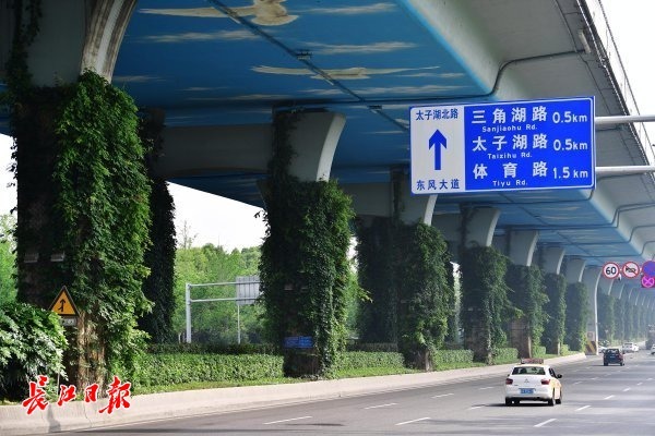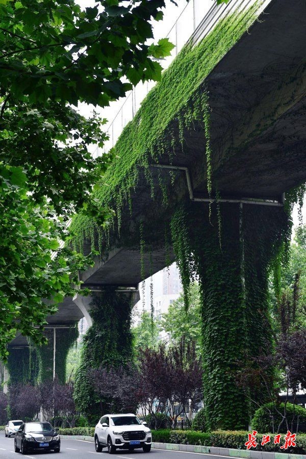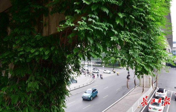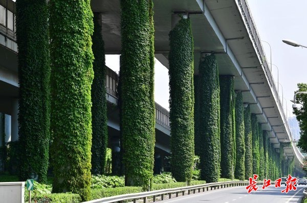 在经开区,东风大道高架桥和三环线常青立交的桥墩也在爬山虎的装饰下,变成了一排排整齐挺拔的绿柱。