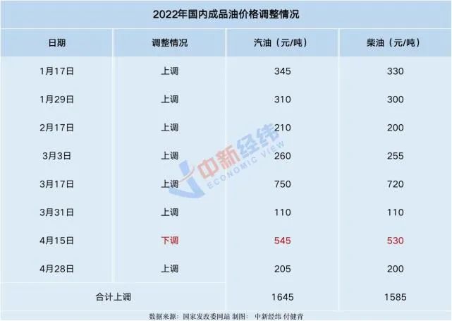 今年以来,国内成品油价格已进行了八轮调整,累计“七涨一跌”,汽油价格累计上调1645元/吨,柴油价格累计上调1585元/吨。在已经上调的七次价格中,最大幅度为3月17日进行的调整,其中汽油每吨上调750元,柴油每吨上调720元。如果本轮调整落实,将是年内第八次上调。