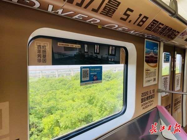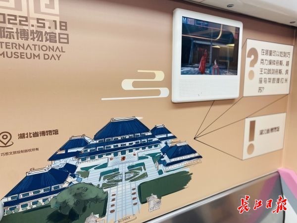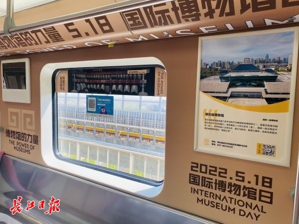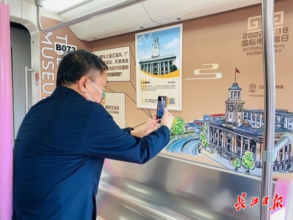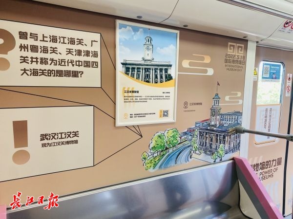 长江日报记者看到,“博物馆专列”内部主题颜色呈浅褐色,显得既庄重又活泼;“博物馆的力量”“红色基因 百年芳华”等各种字样,为即将到来的国际博物馆日渲染了氛围。19家博物馆的外观,还以手绘图的形式呈现,颇具现代感。“武汉的‘江城’美名出自于‘诗仙’李白的哪一诗句?”车厢内还设置了知识问答、手绘博物馆游览地图等互动方式,乘客可以通过扫描相应二维码获取更多场馆信息。这趟与众不同的“博物馆专列”,吸引了乘客的目光。“哇,感觉好特别!”乘客袁女士在常青花园站上车后发出惊呼。她表示走进车厢有种耳目一新的感觉,“非常直观地呈现了武汉的博物馆文化和历史,看着既熟悉又亲切。正好这个周末也能带孩子来打卡博物馆专列,坐着2号地铁还能去江汉关博物馆看看。”