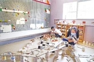 “武汉是一座以桥连起来的城市。孩子们认识桥梁,既能增长见识,也能培养对家乡的热爱。”百灵幼儿园副园长刘丽菲介绍,这学期刚开学,该园师生就一起开始建设这座“桥梁博物馆”。教师和孩子们一起讨论馆内的主题、设计、细节,一起动手制作桥梁模型。第一层楼梯间扶手上的武汉长江大桥模型就是师生们共同创作完成的。孩子们尤其喜欢楼梯间墙壁上的泥塑雕花板,也学着老师的样子捏出了自己的版本。