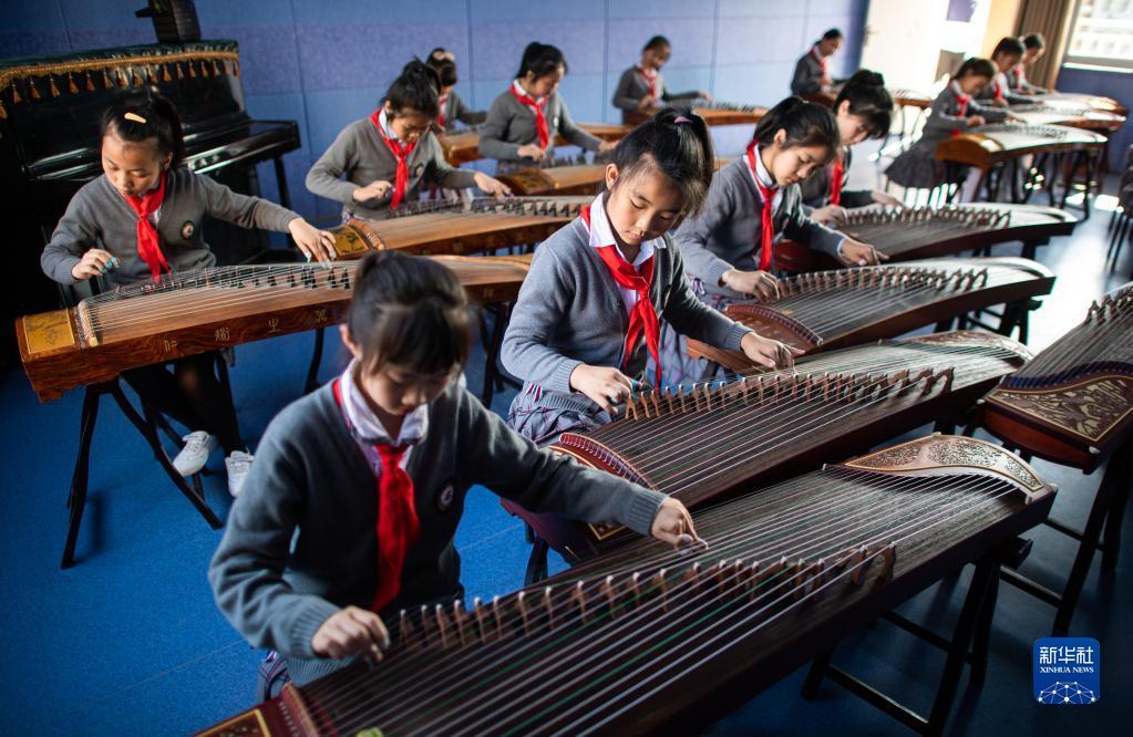 5月16日,湖北省荆州市沙市大赛巷小学学生在课后练习古筝。