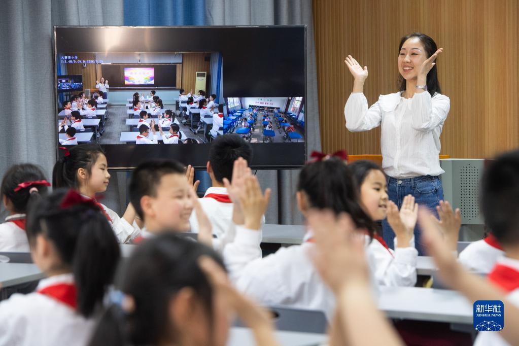 5月16日,在湖北省荆州市沙市大赛巷小学,学生通过“空中课堂”与偏远乡镇的丫角小学一起进行韵律操活动。