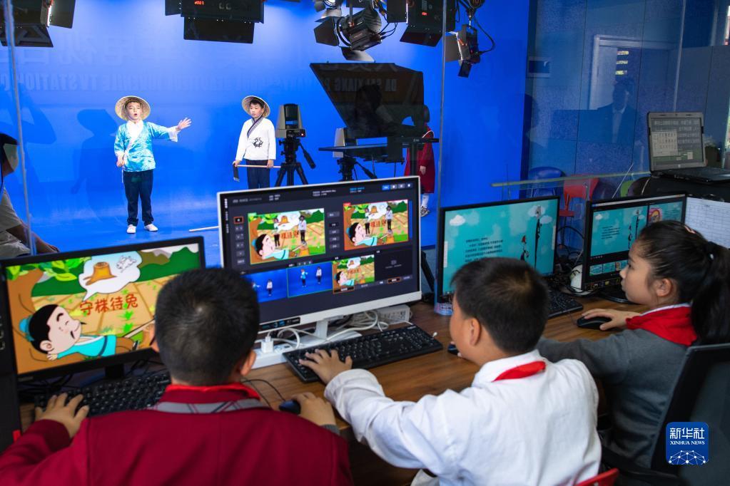 5月16日,在湖北省荆州市沙市大赛巷小学校园电视台,学生在课后进行节目的录制和编排实践。