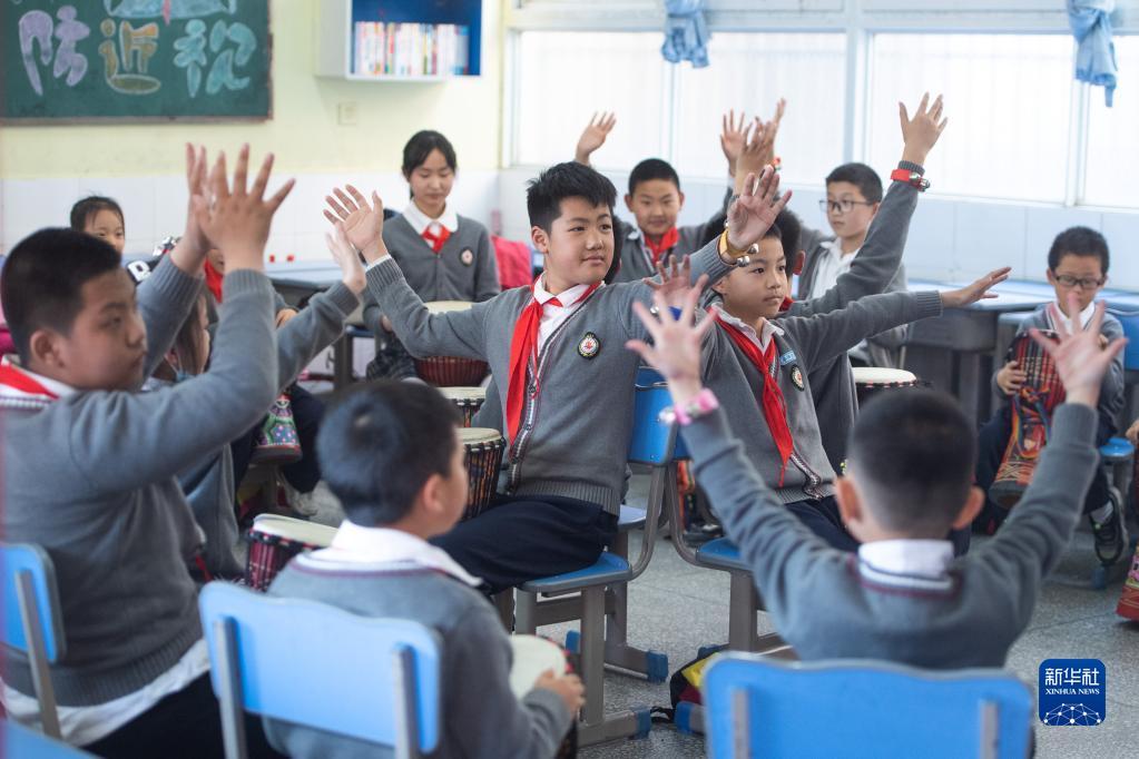 5月16日,湖北省荆州市沙市大赛巷小学学生在活动室表演非洲鼓。