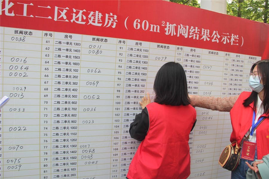 紧张地抓阄、认真地登记、小心翼翼地确认……“真希望能抽到一个好楼层。”居民王伶俐把手伸进透明的抓阄箱里谨慎地抓着,好长时间也舍不得收手。几番摸索,最终还是将手拿了出来——她抓到了4楼。王伶俐告诉记者,以前住6楼没有电梯,上下楼很不方便,楼顶还漏水,虽然没有抽中心仪的2楼,对于这个结果她已经觉得非常满意了。