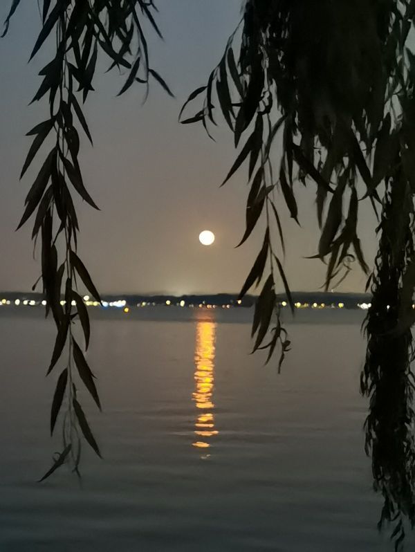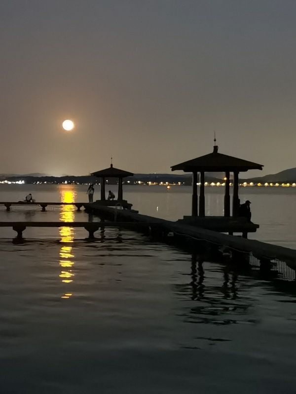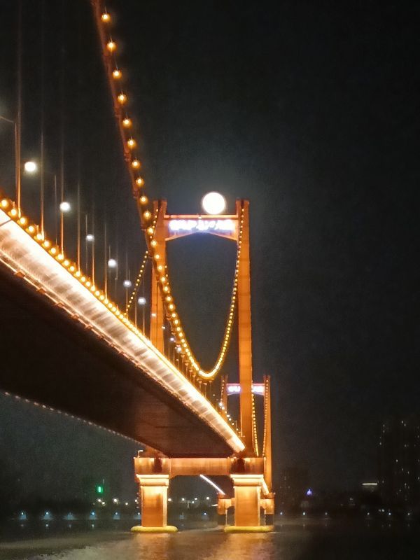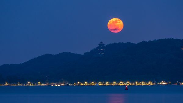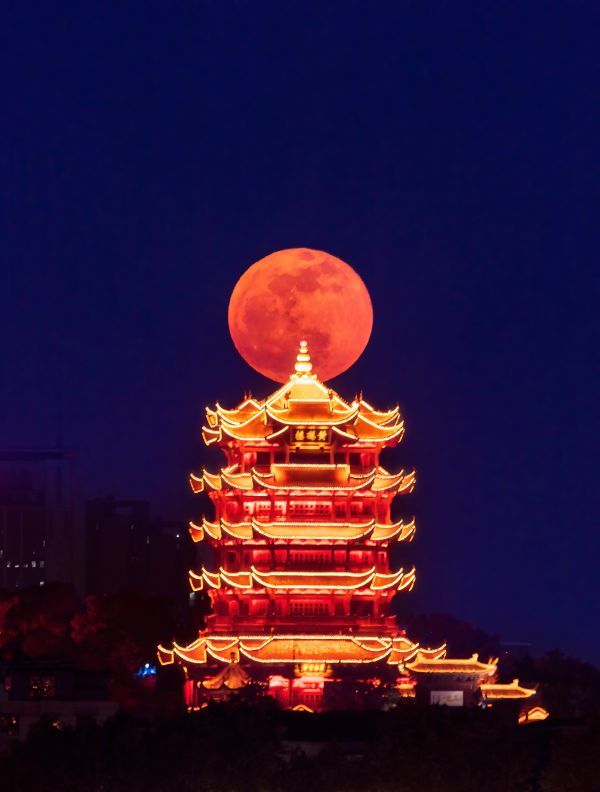 晚7时半左右,天色还没有完全黑,超级月亮就冒出武汉的地平线,又大又圆又亮又近,似乎踮着脚就能摸到。月亮升空很快,十几分钟后恰好挂在黄鹤楼的金顶上。摄影师杨建英用500的长焦,记录了2022年5月16日19时52分这一刻,超级月亮“路过”千古名楼的样子。它们穿着同一色系的华服,色彩和谐,相得益彰。
