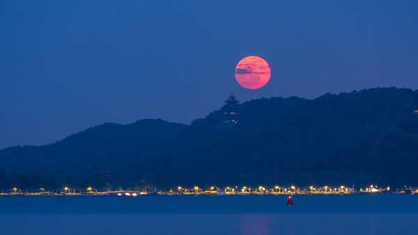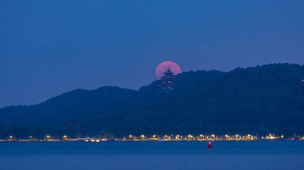 摄影师“hello马里奥”在东湖听涛景区,拍下超级月亮从楚天台升起的过程。