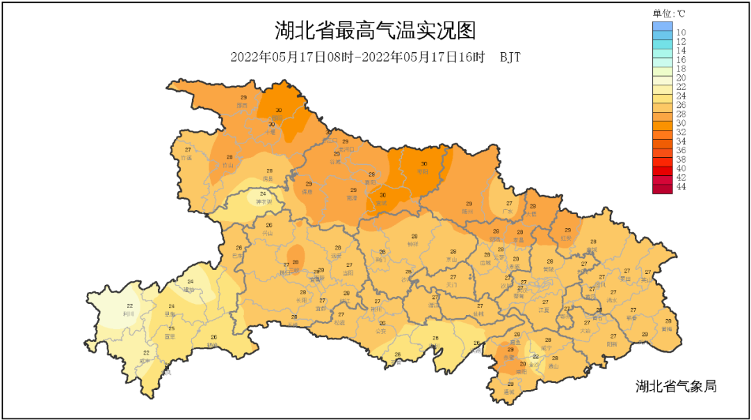 最高气温:鄂西北23~26℃;其他地区19~22℃