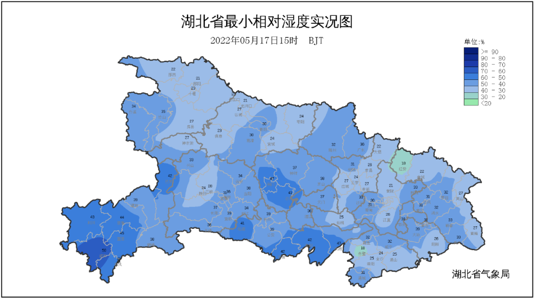 在偏北气流的控制中,今天湖北省空气干燥,午后有一半地区最小相对湿度在30%以下,其他大部地区也仅30~40%,提醒公众外出要注意防晒,多补水。
