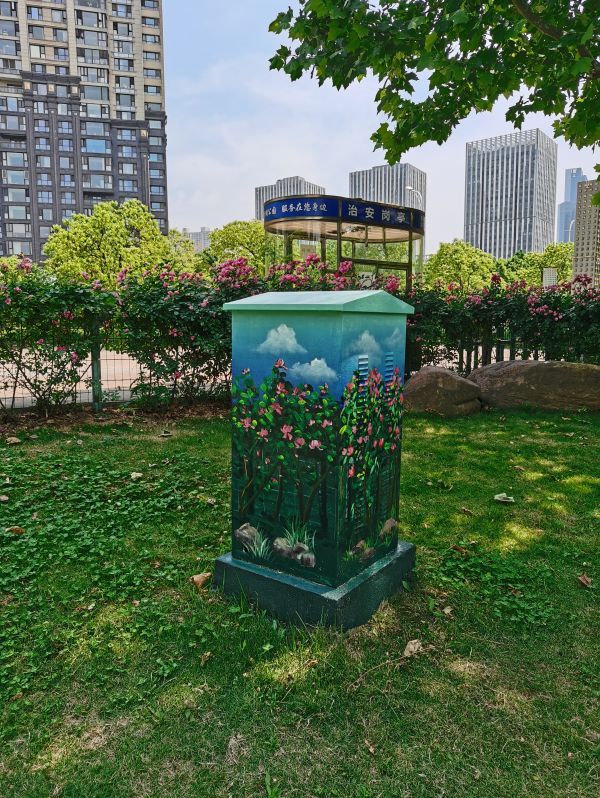 不仅是公园竹林处的配电箱,在DE区的月季围栏、鹭园(D区)的酢浆草花海,公园里多处配电箱都换上新颜,有的繁花绽放、有的绿树成荫、有的湖水静谧……青、绿、黄的主色调,勾勒出公园美景,彩绘后的配电箱不仅外形美观,更与周围的景观特色相互融合,令人赏心悦目。