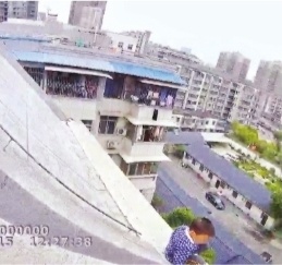 视频显示4岁男童翻越顶楼护栏玩耍。