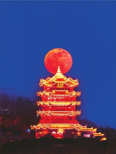 晚7时30分左右,天色还没有完全黑,超级月亮就冒出武汉的地平线,又大又圆又亮又近,似乎踮着脚就能摸到。月亮升空很快,十几分钟后恰好挂在黄鹤楼的金顶上。摄影师杨建英用500的长焦,记录了2022年5月16日19时52分这一刻,超级月亮“路过”千古名楼的样子。它们穿着同一色系的华服,色彩和谐,相得益彰。