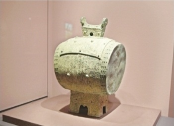 接着,魏冕带记者看了第一件青铜乐器,一件1959年出土于湖南宁乡师古寨山顶的铜质象纹庸,它铸造于商代晚期。它是击奏体鸣乐器,合瓦形,中空,无舌,口朝上执柄,以撞木或钟槌击奏。分别击奏庸体正、侧鼓部,可各得一音,常见两音略呈大二度音程。此时的“一钟双音”为合瓦形铃属乐器的自然现象,即“原生双音”。庸为甬钟的前身。商、周之际,庸过度为甬。周代,在木架上悬挂一组音高不同的组合甬钟,成为编钟。