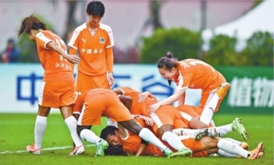 武汉车谷江大女足球员在场上庆祝。