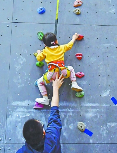 3岁的小朋友在爸爸的帮助下学习攀岩。长江日报记者喻志勇 摄