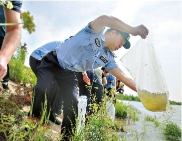 警方参加非法捕捞案件的增殖放流督促执行活动。 通讯员谢威 摄
