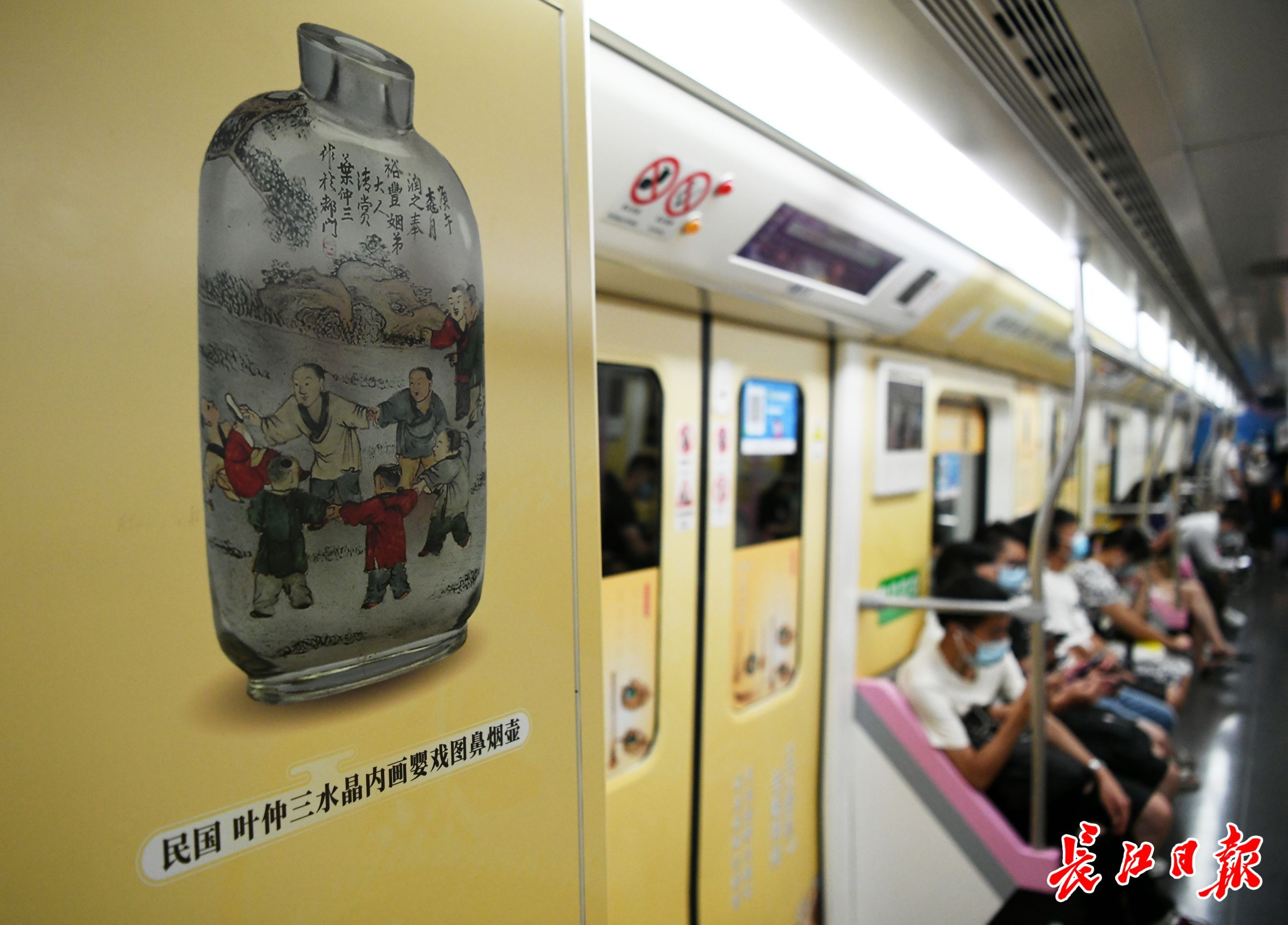 2021年9月,武汉上线地铁博物馆国潮风专列。将武汉博物馆馆藏瓷器、玉器、青铜器、古代书画等精品文物,用精美的图片和简洁、生动的文字,根据不同车厢的主题进行布置,营造出传统文化的艺术氛围。市民搭乘2号线,很可能突然发现自己身处于磅礴大气的青铜重器中、温润雅致的玉石珍玩旁、翰墨淋漓的书画卷轴前。