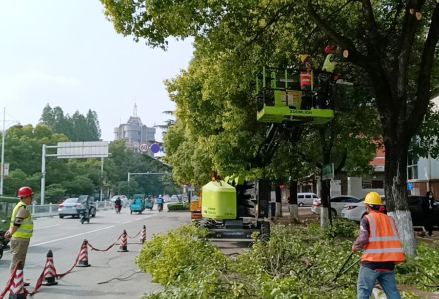 在章华北路,市城发置业集团工作人员利用高空作业车为两旁行道树木进行修枝整形,通过修剪,一直藏在枝叶后面的道路标示牌指示灯等也露出了完整“容颜”,一片绿树成荫、干净整洁、精致有序景象。