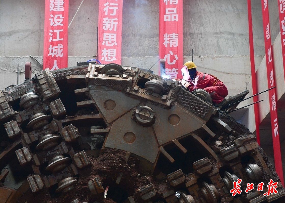 上午9时许,长江日报记者深入30多米深的前川线巨龙大道站底部,只见“昆仑33号”盾构机刀盘已经破土出来,施工人员正在顶部焊接吊装构件,准备将盾构机分批吊装至地面。