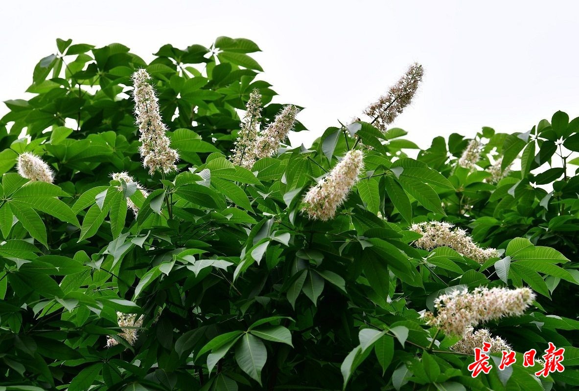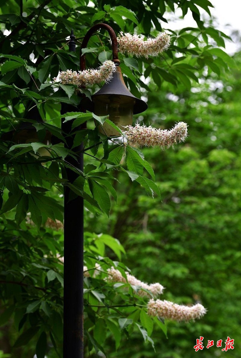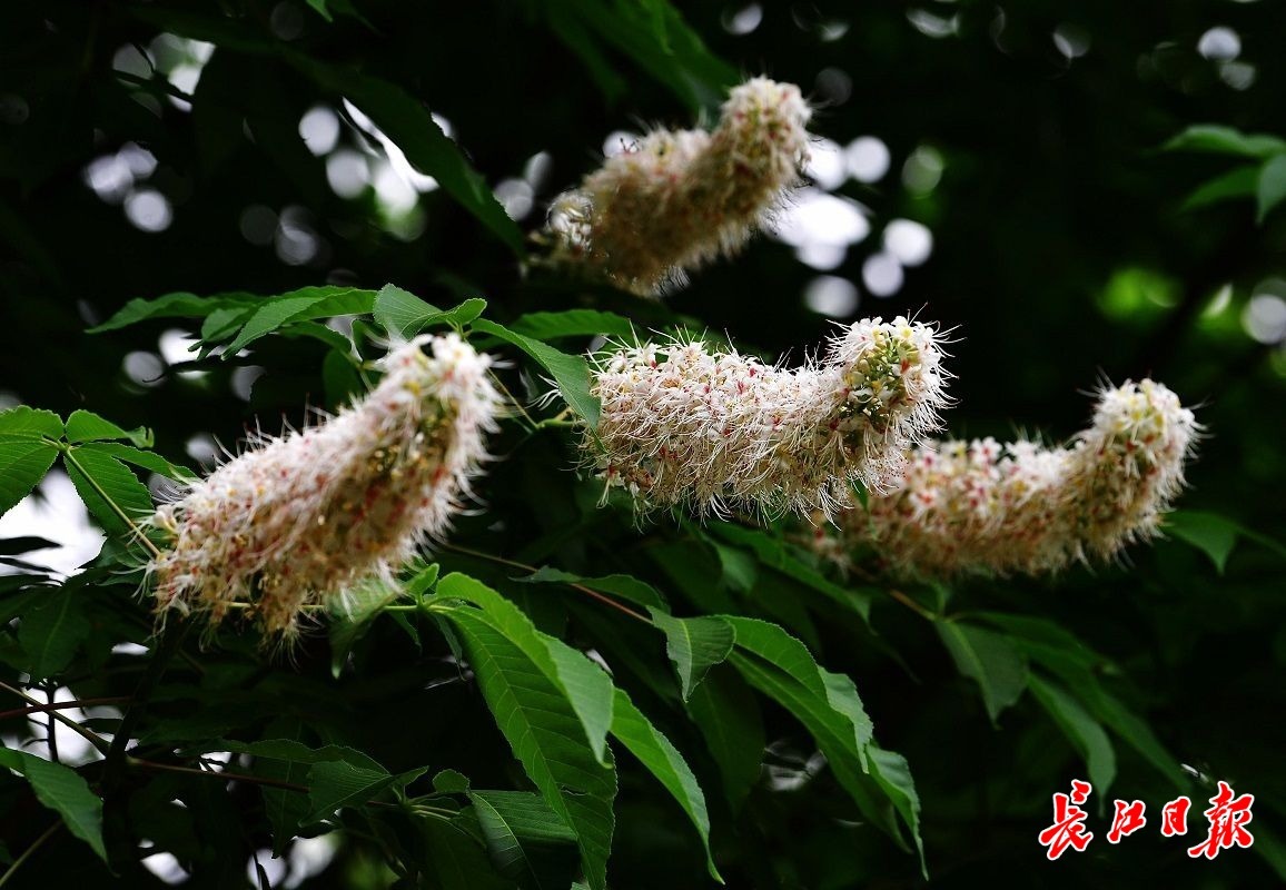长江日报大武汉客户端5月18日讯 5月18日,武汉园林科普公园内,几棵大树浓密的枝叶间,横着一个个白色的毛茸茸的“大虫”,又有点像羊尾巴。走近细瞧,原来是大树开花了。