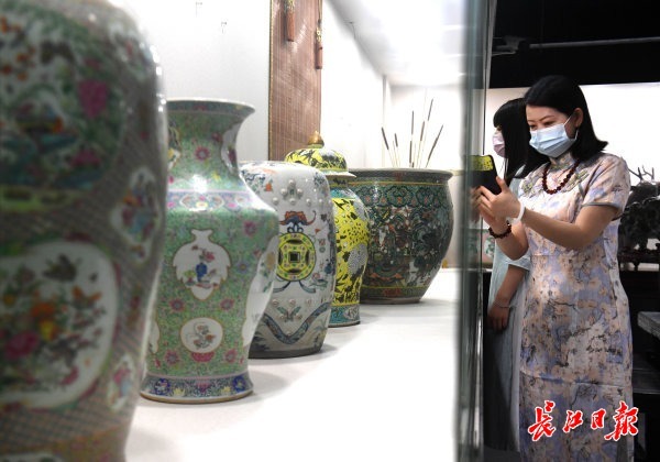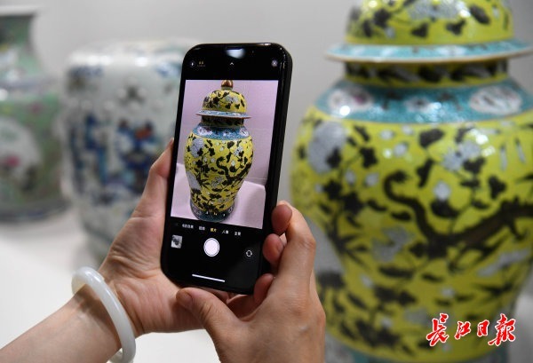 观众在古今堂展馆用手机拍摄同治年间的黄地堆彩龙纹花卉将军罐。