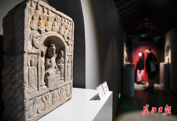 市民在武汉市贞元博物馆欣赏古代石雕。