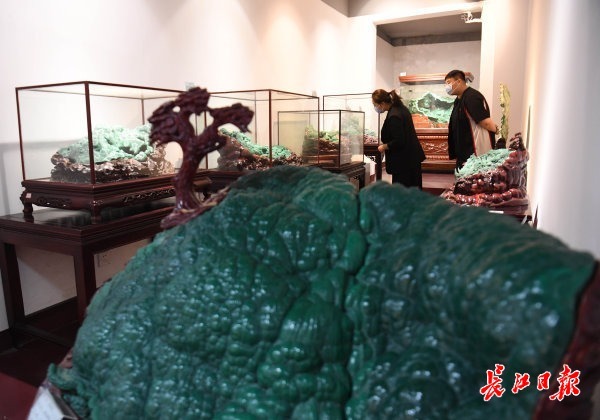 市民在武汉天人合一奇石博物馆观石绿,赏松石。
